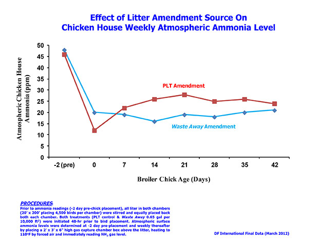Waste Away not only breaks down the organic matter portion of chicken litter, but efficiently converts ammonia into the stable (and not noxious) ammonium. This reduction in ammonia gasses in poultry houses has shown to improve broiler and layer health and lessen mortality.