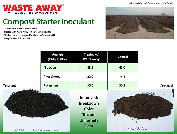 The Carbon "Super-Degrader" microbes contained in Waste Away make a superb starter inoculant for compost piles. These thermophilic bacteria can withstand the high heat incurred in the compost process, and effectively speed up and enhance the break down of organic materials. The microbes also convert nutrients to stable forms during the process, improving the nutrient analysis and look of the finished product. Suggested rate = 1 gallon/25 tons raw product